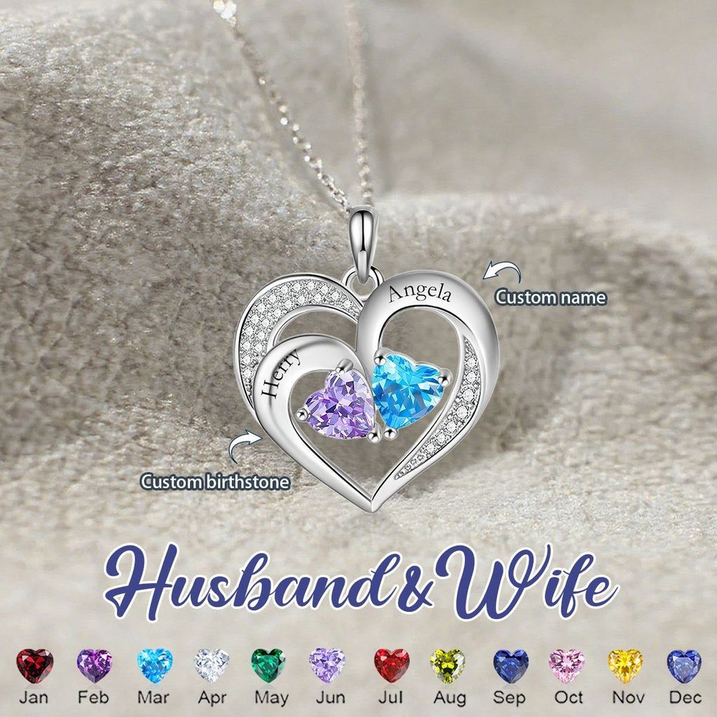 Ceci Collier de pierre de naissance de couple en forme de cœur personnalisé Est plus que de simples bijoux-c'est un vœu d'amour portable, un témoignage étincelant de votre lien unique. Conçu pour les romantiques sans espoir, l'élégant pendentif cœur comporte deux pierres de naissance étincelantes, symbolisant vos essences individuelles, associées à vos noms gravés dans un script délicat.