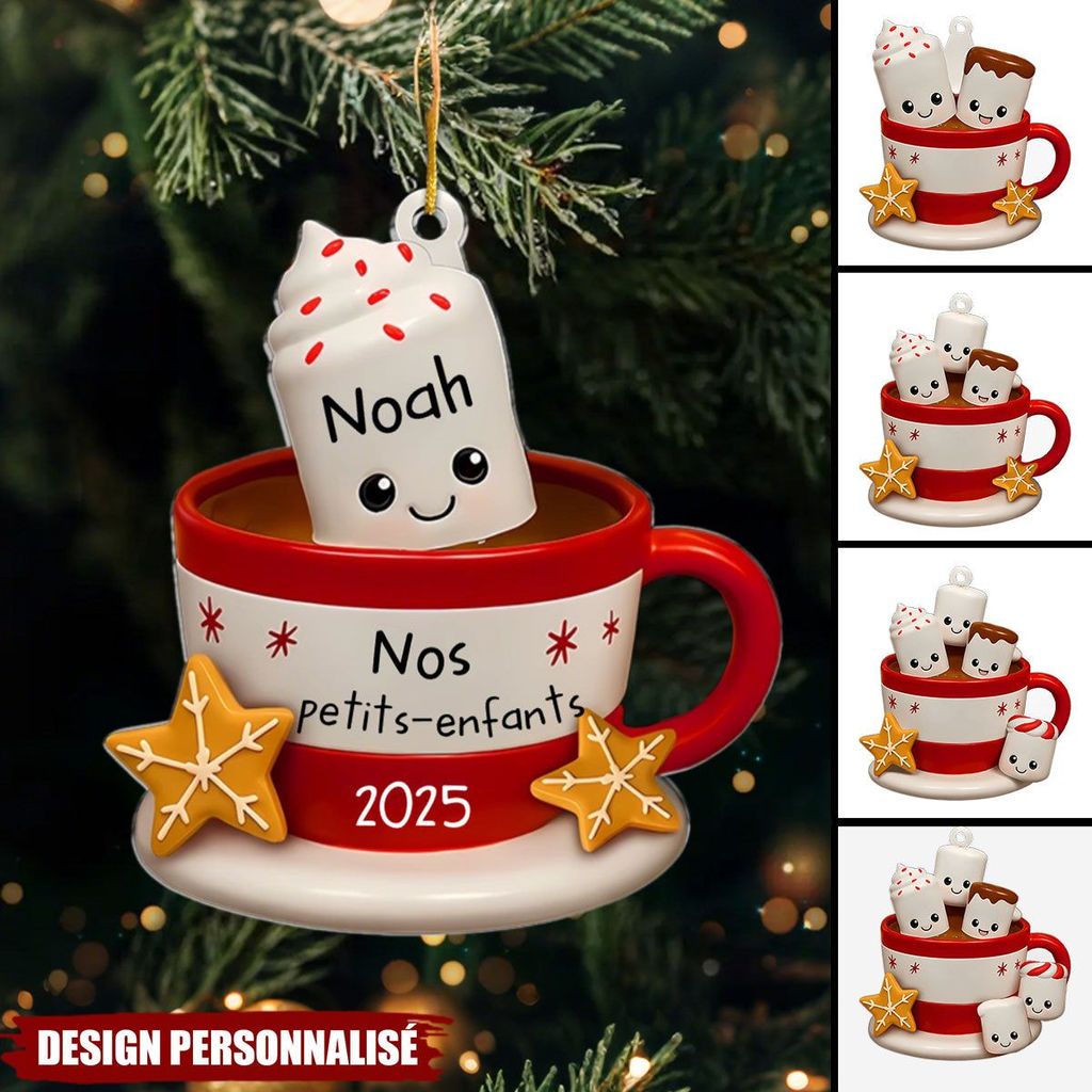 Ornement de Noël en Acrylique Personnalisé – Tasse de Chocolat Chaud avec Prénoms des Petits-Enfants