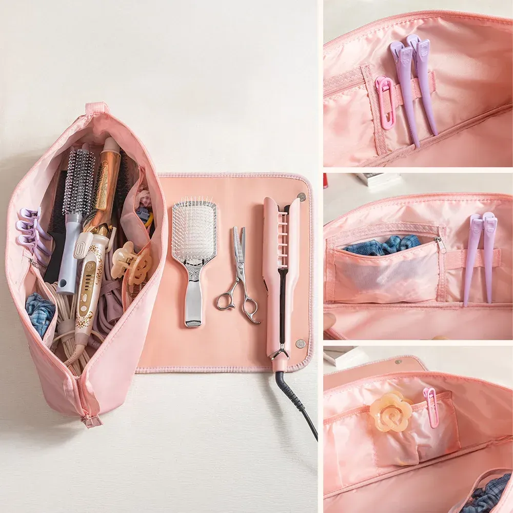 Ce sac est doté de plusieurs compartiments, dont deux poches internes, une poche à fermeture éclair et des sections élastiques pour les pinces à cheveux. Il permet d'organiser efficacement tous vos outils de coiffure, tels que les lisseurs, les fers à friser et les brosses, en gardant tout bien rangé et à portée de main.